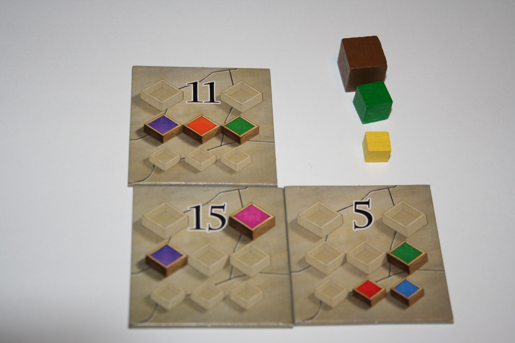 Shapes and sizes– I already mentioned how Stone Age uses different shapes for their goods along with the different colors, which makes things easy as pie to tell them apart. The second example I want to throw out is the game Fresco. Fresco, is another game completely based on color and painting, but it’s use of size of it’s cubes makes it easier to play. The basic colors are all one smaller size, the second set of colors is a second size and the most advanced colors (brown and pink in game) are a completely different size. Not only is this an easier thing to see once explained, but also the tiles you are to claim keep the colors in the same place on each card. If you were going to look at a card with a color cost all you have to know is which color is on which side of the tile and you can extrapolate what colors are needed. When we played this only at the beginning of the game did Todd have to say “so what color is this”.
