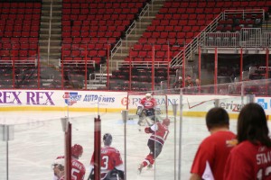 But before warm ups Shane Willis, who organized the event and a damn good NHLer in his own right, came walking into the room saying “Get ready boys, looks like a packed house, we just had to open up a few more sections!” Holy cow, more?!?! They orig were going to just have the east side open at center ice, but now they opened a few more sections. Spilling over to the area behind the white team goal. This place had the very big possibility to get LOUD tonight. Then it was time to hit the ice. We all lined up to head out for warm ups in the hall leading to the ice. Tripp Tracy, long time color man for the Canes and the white goalie lead us out. Being pretty close to the front I was going to be one of the first few Red players to the ice for the warm ups so I wanted to make a good entrance. One which would get us and the fans fired up. I hit the ice in stride and sprinted as hard as I could to the far boards and made that turn to head to the net. People were going crazy and this was the first time I could feel the ROAR and energy of the crowd starting to get us fired up to play.