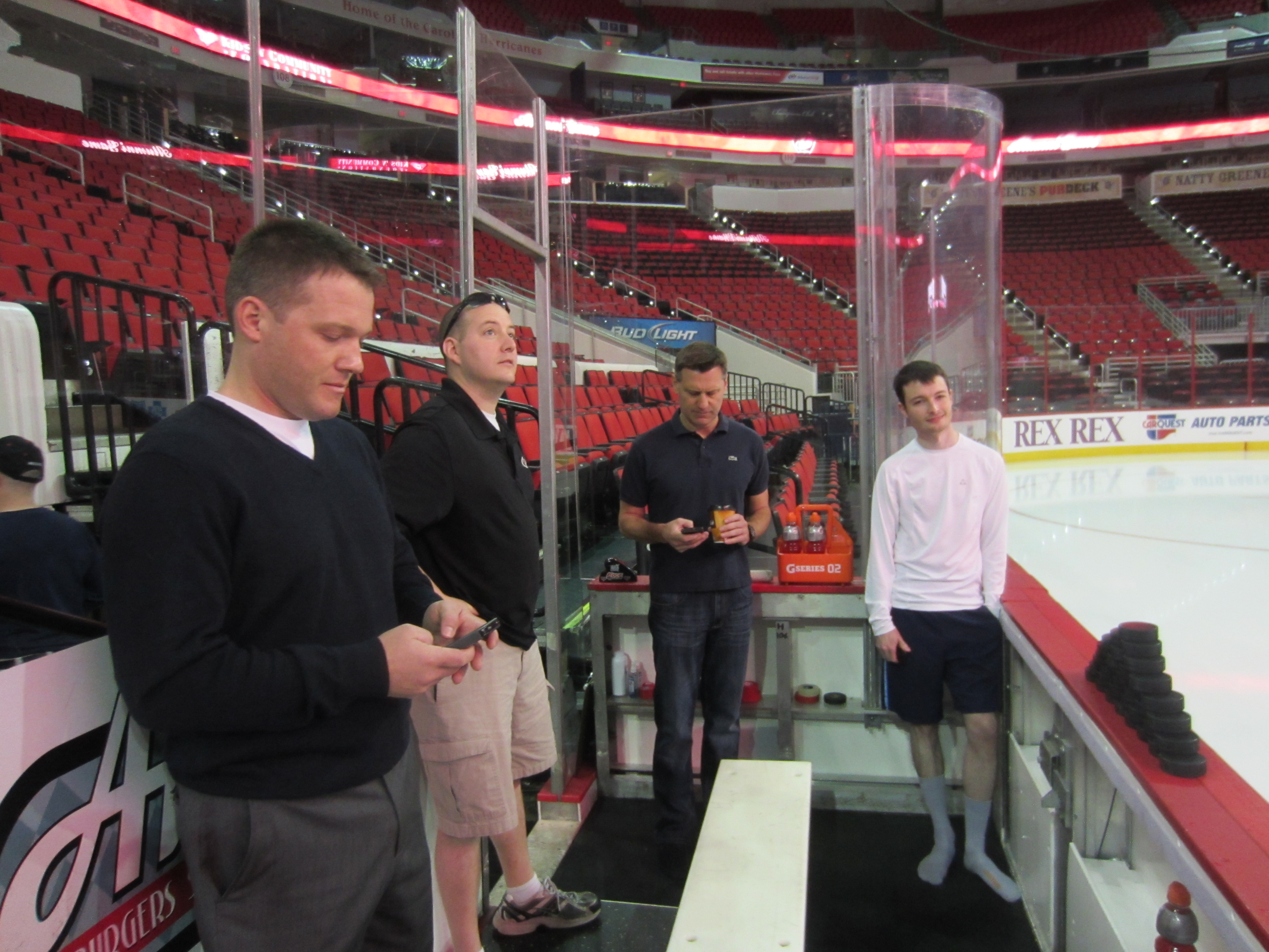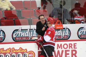 Warm ups were quite a blast. I got to get a few laughs in with Henry Staal, and with Aaron Ward. As well as somehow being able to uncork some decent shots. My first shot was a blast, but was about 5 feet wide left and I thought it was going to be a long day haha. But, I rebounded and put some nice shots on net, and scoring some on them, which always helps to get your confidence up in the pre-game. Once basically all the pros were gone I tried to help organize some more drills for the remaining guys, grabbing some pucks in the corner and doing some passing to one-timers drills for those of us who were left. Most of the passes were spot on and some guys were getting off some GREAT shots so it seemed we ALL were feeling that adrenaline rush. After this I was about to head off the ice to rest for the big game (after all you can’t leave it ALL on the ice for warm ups) when Canes announcer, and emcee for the day, Mr. John Forslund grabbed me for a pre-game interview. This was yet ANOTHER great way we all felt like pros for the day. Johnny grabbed each and every one of us at some point in the day and did a decent length interview. I felt like I was being asked how the team was going to do headed into the playoffs! Another g