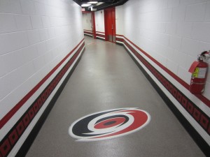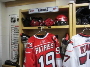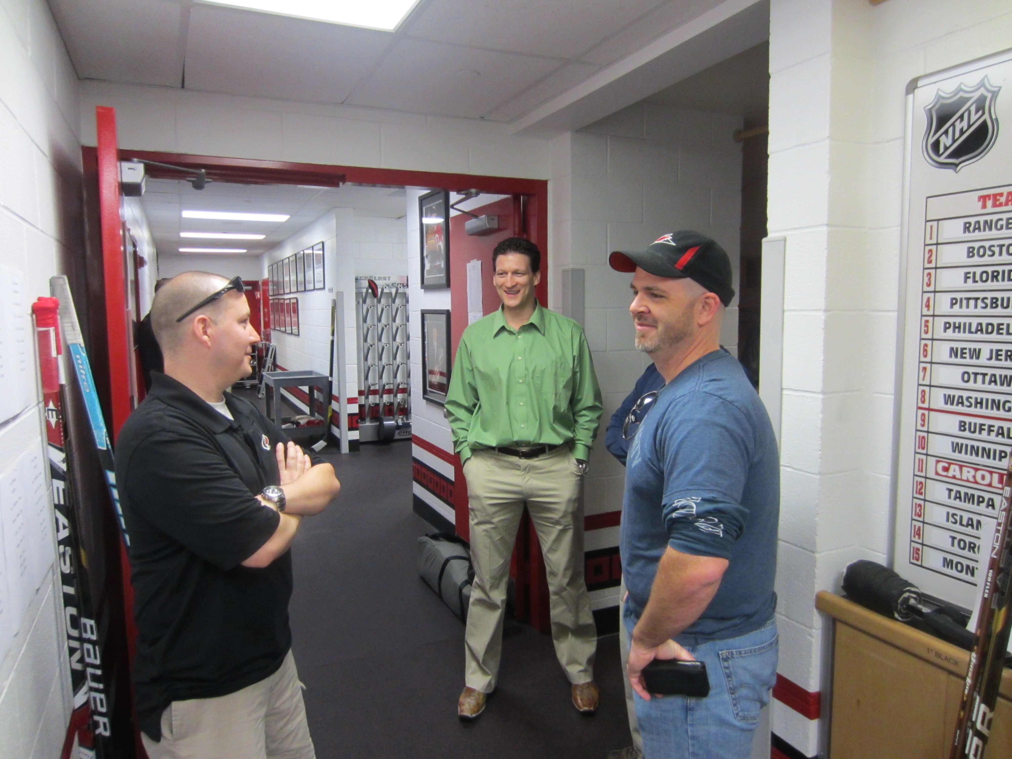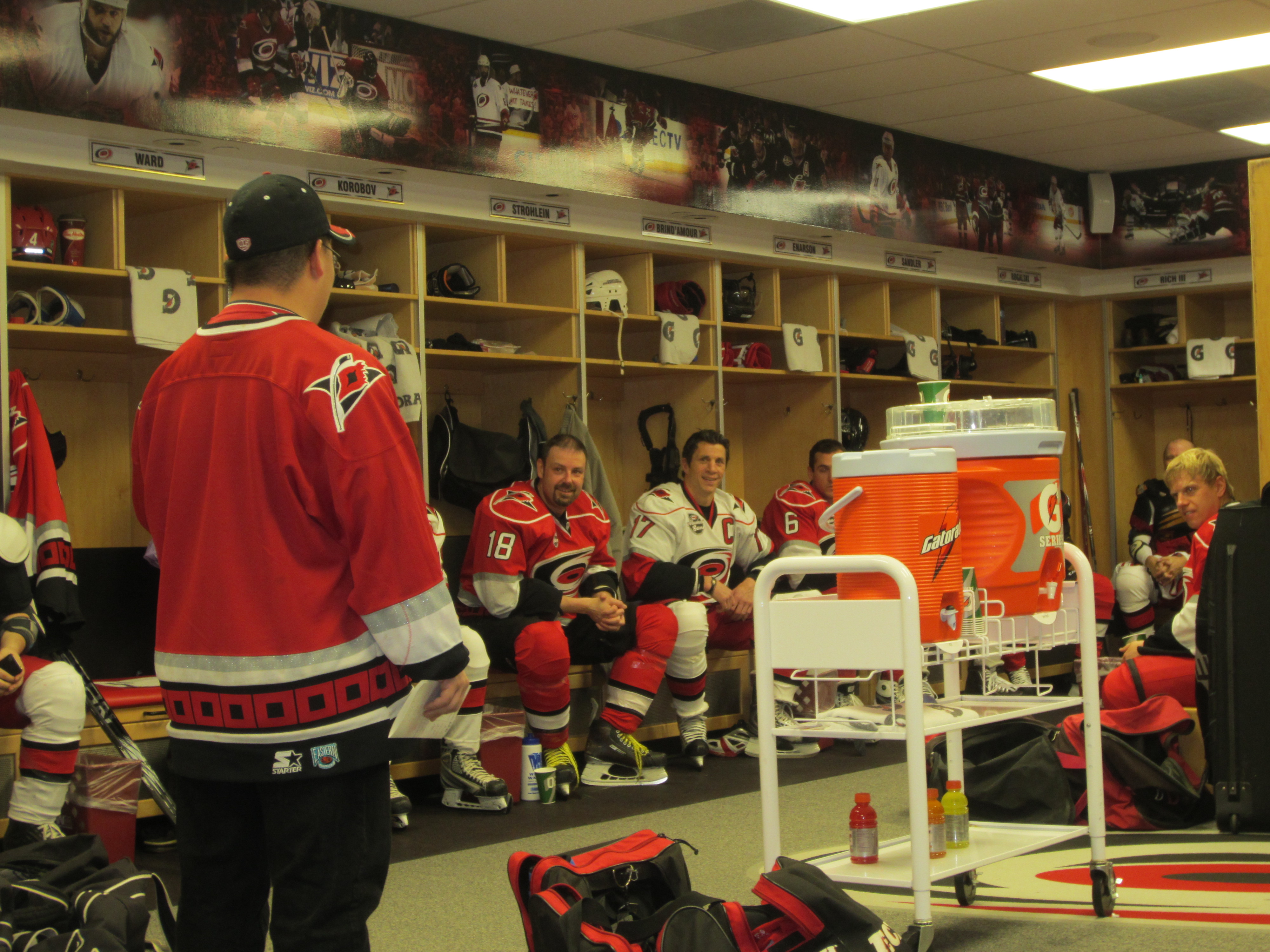 were greeted by Doug Warf (asst marketing for canes and for Kids N Community Foundation). Doug was awesome the whole day at directing us and generally pumping us up and making all of us feel welcome (Thanks Doug!). Once I got into the building through the players entrance I started down the hallway. I immediately got goosebumps as I saw the Canes symbol on the floor down one hall, then the Canes flag down the next hall….. edging closer and closer to the Canes locker room where our locker/stalls were waiting for us all. As I rounded the corner I saw some guys hanging out all smiles and then I proceeded to look around the room. It was all surreal. I couldn’t believe my eye and how great it felt. I was going to be changing here (I know I am a broken record but can you tell I was/and am excited about this event?) amongst some of the greatest players ever to lace up skates in the NHL.