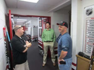 Then I noticed something. Huh? Where is my locker? I was casually trying to scan around the room to see where guys where and where they pros were. The pros were all prolly where they once sat in this very room, and Mr. Henry Staal was likely in his son’s (Eric) locker space. But, again where was mine? I couldn’t find it. I was trying to act cool, but deep down I was shivering, I haven’t been here one minute and I felt like I screwed something up already. Then I turned around and AHHHHH there it was. I just happened to be the very FIRST locker as I entered the room. For whatever reason I just walked by it when I was looking around. Yet, the BEST part of all was seeing the most amazing sight of the day. MY jersey hanging up in MY locker, like it was supposed to be there all along. All was at ease and it was time to start the big day. So I unpacked my gear and took a few pictures of the room and the inner workings of the behind the scenes of the Canes. Things you don’t see every day, like the trainers room, the stick room, the sharpening station. I then just went out the door where the Canes room joins to the ICE, where the Cane rush onto the ice every night. A few of us just hung out on the bench and took it all in. It was an eerie quiet, yet a gentle one as well. All four of us on the bench could just tell what we were thinking WOW. We remarked how glass smooth the ice was and how cool it was to see the jumbo tron this close. We all had a nervous energy about us and no one was yet at ease. But about 15-20 mins later that would all change. When (My fav all time Cane) Rod Brind’Amour came into the locker room, he went around to each and EVERY participant and shook their hand and introduced himself. He took a couple of mins with each guy and made us feel welcome. Right after him Ron Francis did the exact same thing. There was something about these gestures from two of the greatest Hurricanes, no, two of the greatest NHLers! ever