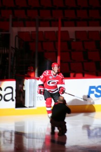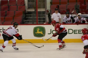 The first period I was primarily paired up on D with Steve Halko, which was probably my favorite part of the game. I think besides another regular joe, like me, Jonathan Pollock, I played the most with the former Cane Halko. Halko was a real easy guy to talk to and play with. He read my plays well, we moved well off of each other and just had a real chemistry out there. Granted, I am well aware it was 99.999% him making me look good and feel this way, but it was still very cool. He had a way on the bench and on the ice of making the shifts be about me, and not about padding his stats for the game. He’s got great hands and still has a cannon of a shot. Unfortunately, the only thing that is really sticking out in my mind personally from the 1st period is a decent rush I had up the ice. I poked the puck free from someone in the neutral zone and was off to the races. I had one man to beat, and he was a good one. Meluch was waiting for me on his Left D side and I was going to have to make a good move to get around him. I got the first step nicely around him and poked the puck past him on the boards, but unfortunately he was able to reach back and get a second swipe at it and knock it behind me. Fortunately for me, it skitted out to one of my guys who sent it towards the net. In fact, since I was curling up the wing, it skitted right to where I was. I had exactly what I wanted…. a 1 on 1 down low with Tripp Tracy. It was just me and him…. BUT, I could feel footsteps, and knew the Tracy poke check could be coming too… I knew I had to be fast…. I tried a little head fake and tried to go 5-hole… I didn’t get it along the ice like I had wanted and Tripp got his stick