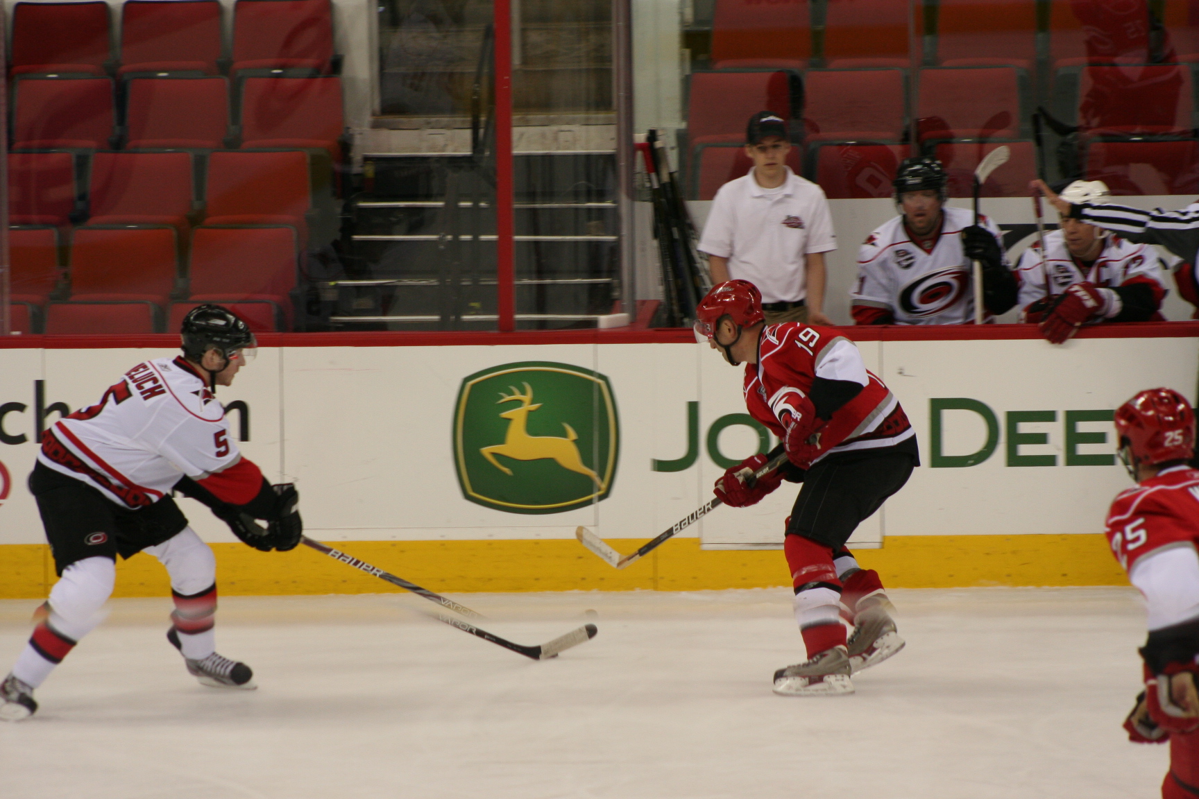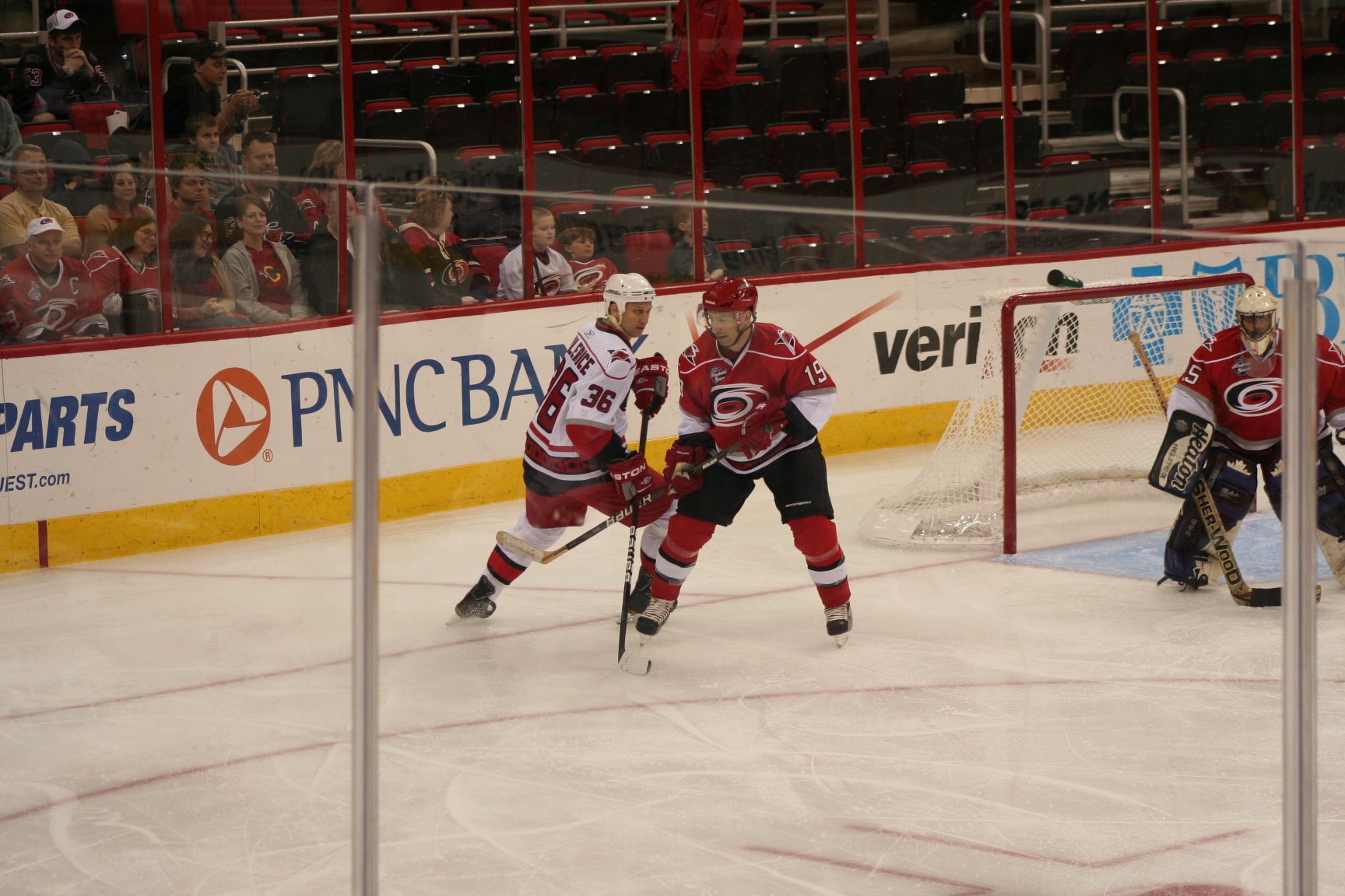 normally goes… In our Canes Alumni game Forslund screamed out EMPTY THE BENCH!!! So we did. We threw all 19 skaters onto the ice to try and score a goal… and score we did! I was in decent position for the 19-5 advantage, but good old Korobov, in white, saw me out there and grabbed a hold of me. A good play, in fact, since I was going to be in good scoring position, but we managed to net the goal anyway bringing it to 9-6. (A nice goal by NAathan White IIRC his 2nd of the game)